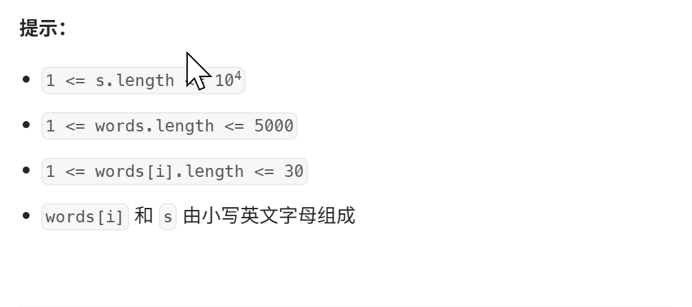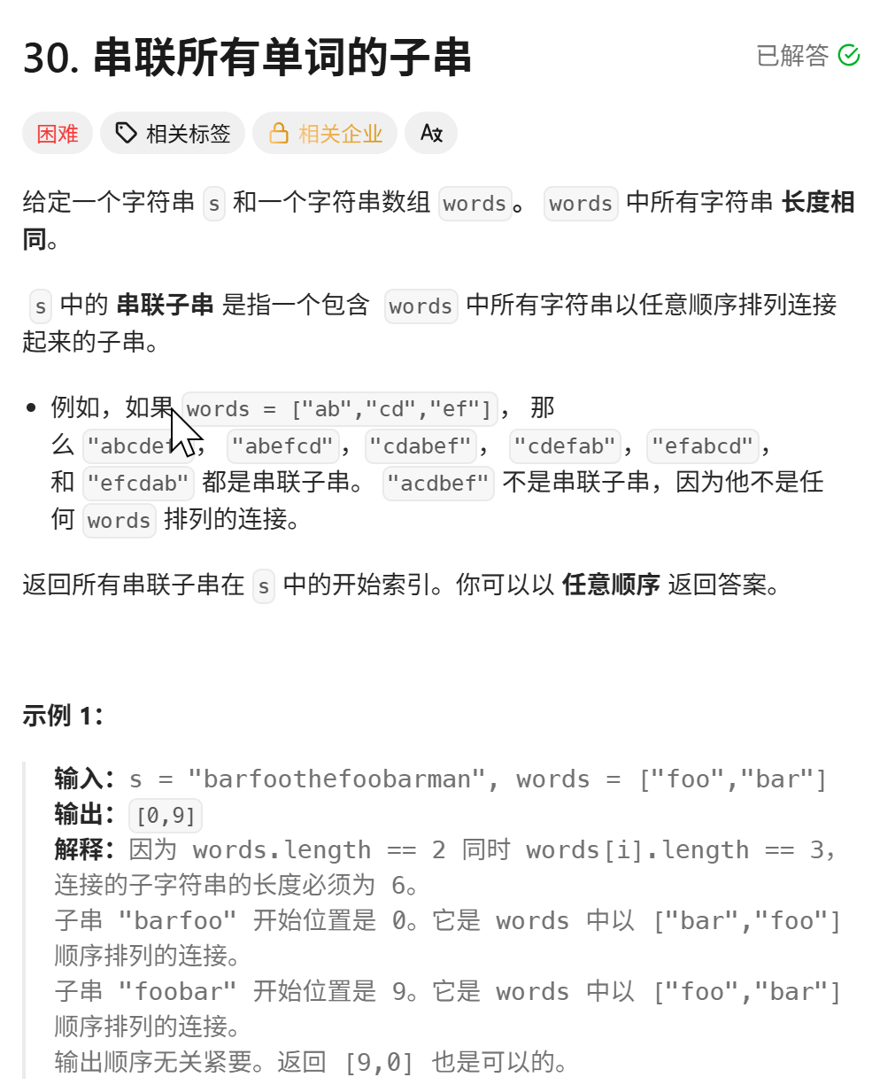 class Solution {public List<Integer> findSubstring(String s, String[] words) {List<Integer> res = new ArrayList<>();//进行特判//字符串不可能为nullif(s.length() == 0 || words == null || words.length == 0 ) {return res;}//进行设置变量:每个单词的长度、单词的个数、拼接好的字符串的长度//每个单词的长度int wordLen = words[0].length();//单词的个数int len = words.length;//拼接好的字符串的长度int wordsLen = len*wordLen;//设计map进行统计每个单词出现的次数Map<String,Integer> map = new HashMap<>();for(String word:words) {map.put(word,map.getOrDefault(word, 0)+1);}//滑动窗口进行设置//外层循环 for (int i = 0; i < wordLen; i++) 的作用:处理对齐问题for(int i=0;i<wordLen;i++) {//设置左右边界int left=i,right=i;//创建一个新的统计map序列Map<String,Integer> mp = new HashMap<>();while(right+wordLen<=s.length()) {//截取当前得到的单词String str = s.substring(right,right+wordLen);//更新right的位置right+=wordLen;//在map中不存在strif(!map.containsKey(str)) {// 说明一整个序列都不符合mp.clear();// 直接跳过这个序列left = right;}//当前截取的str在map中存在else {//进行统计单词频数mp.put(str, mp.getOrDefault(str, 0)+1);//进行判断当前的mp各个单词的数量是否超过数组中统计的mapwhile(map.get(str)<mp.get(str)) {//直接删去两个重复的,但我们并不确定重复的位置,所以只能从left一直试探String leftWord = s.substring(left,left+wordLen);mp.put(leftWord, mp.getOrDefault(leftWord,0)-1);// 进行更新leftleft+=wordLen;}}if(right-left == wordsLen) {res.add(left);}}}return res;}