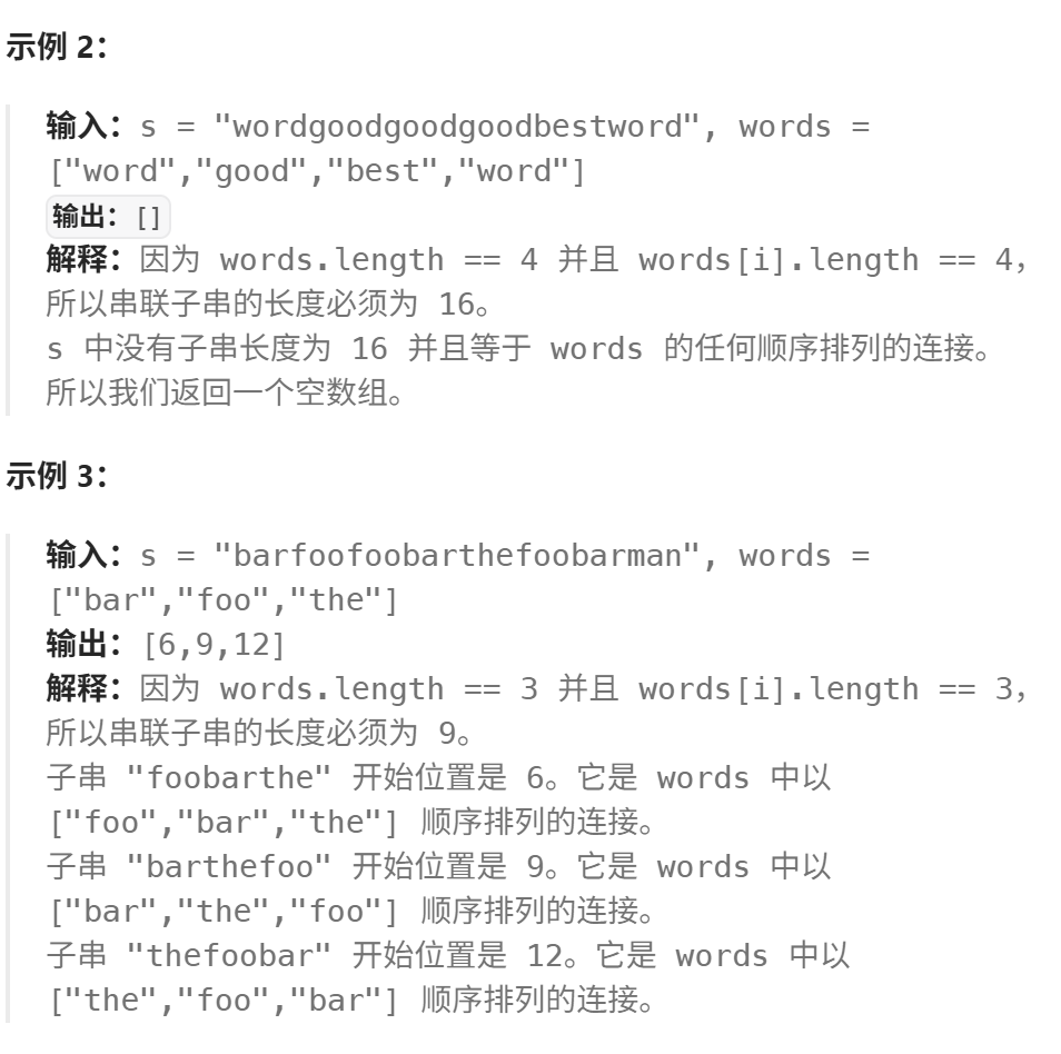 import java.util.*;class Solution {public List<Integer> findSubstring(String s, String[] words) {if (words == null || words.length == 0 || s.isEmpty()) {return new ArrayList<>();}// 每次调用都创建新的局部变量,避免全局污染!List<String> list = new ArrayList<>();StringBuilder ls = new StringBuilder();boolean[] bs = new boolean[words.length];// 生成所有唯一排列(注意:words 可能有重复,需去重)dfs(0, bs, words, ls, list);// 去重(因为 words 可能有重复元素,如 ["bar","bar"])Set<String> uniqueSet = new LinkedHashSet<>(list);List<Integer> result = new ArrayList<>();for (String concat : uniqueSet) {int index = s.indexOf(concat);while (index != -1) {result.add(index);index = s.indexOf(concat, index + 1); // 修复:+1 避免死循环!}}return result;}private void dfs(int depth, boolean[] used, String[] words, StringBuilder path, List<String> result) {if (depth == words.length) {result.add(path.toString());return;}for (int i = 0; i < words.length; i++) {if (!used[i]) {used[i] = true;path.append(words[i]);dfs(depth + 1, used, words, path, result);path.delete(path.length() - words[i].length(), path.length());used[i] = false;}}}