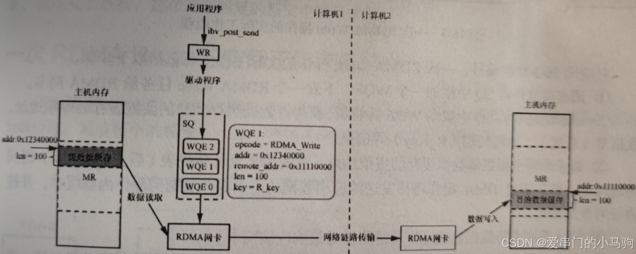 (2)WQE包含信息有{操作类型、本地数据的虚拟首地址、数据长度,远端数据的虚拟首地址、秘钥},并添加到SQ(发送工作队列)中