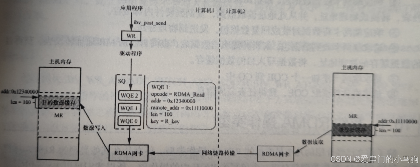 (2)RDMA网卡收到WQE元素后,解析其中数据,之后从主机内存读取数据通过网络链路发送。