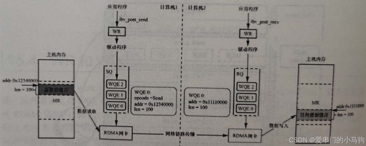 (1)CPU调用Verbs API ibv_post_send发起WR,驱动程序将WR映射为WQE,包含信息有{操作类型、发送数据的首地址、数据长度},并添加到SQ(发送工作队列)中;