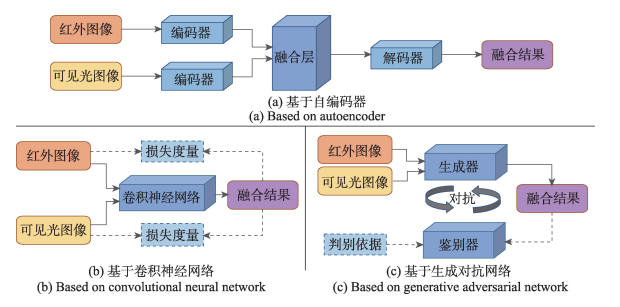 [64] 提出了以生成对抗网络为核心的融合模型,通过对抗学习提升融合图像的自然性、对比度与细节保真度,使生成结果在视觉质量上更为逼真。