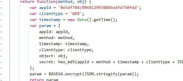 <head><meta charset="UTF-8"><title>Title</title><script src="https://cdn.bootcdn.net/ajax/libs/crypto-js/4.1.1/crypto-js.min.js"></script><script>const askkGFJ5KlKY = "a5slhqEdLos7hvjr";const asi1rHbZTh7V = "bhb9eTODiif32jv0";const dskoNjS2oMS6 = "hXenRdbrF1iqaMLr";const dsi7NK4eh564 = "xAWozmps3eqYftMA";function hex_md5(data) {return CryptoJS.MD5(data).toString()}var DES = {decrypt: function (text, key, iv) {var secretkey = (CryptoJS.MD5(key).toString()).substr(0, 16);var secretiv = (CryptoJS.MD5(iv).toString()).substr(24, 8);secretkey = CryptoJS.enc.Utf8.parse(secretkey);secretiv = CryptoJS.enc.Utf8.parse(secretiv);var result = CryptoJS.DES.decrypt(text, secretkey, {iv: secretiv,mode: CryptoJS.mode.CBC,padding: CryptoJS.pad.Pkcs7});return result.toString(CryptoJS.enc.Utf8)}};var AES = {decrypt: function (text, key, iv) {var secretkey = (CryptoJS.MD5(key).toString()).substr(16, 16);var secretiv = (CryptoJS.MD5(iv).toString()).substr(0, 16);secretkey = CryptoJS.enc.Utf8.parse(secretkey);secretiv = CryptoJS.enc.Utf8.parse(secretiv);var result = CryptoJS.AES.decrypt(text, secretkey, {iv: secretiv,mode: CryptoJS.mode.CBC,padding: CryptoJS.pad.Pkcs7});return result.toString(CryptoJS.enc.Utf8)}};var BASE64 = {encrypt: function (text) {return btoa(unescape(encodeURIComponent(text)));},decrypt: function (base64Str) {return decodeURIComponent(escape(atob(base64Str)));}};function get_data(data) {data = AES.decrypt(data, askkGFJ5KlKY, asi1rHbZTh7V);data = DES.decrypt(data, dskoNjS2oMS6, dsi7NK4eh564);return BASE64.decrypt(data)}function get_params(method, obj) {var appId = '0e5df784c9068129938846e4fd750fdd';var clienttype = 'WEB';var timestamp = new Date().getTime();var param = {appId: appId,method: method,timestamp: timestamp,clienttype: clienttype,object: obj,secret: hex_md5(appId + method + timestamp + clienttype + JSON.stringify(obj))};return BASE64.encrypt(JSON.stringify(param));}</script>