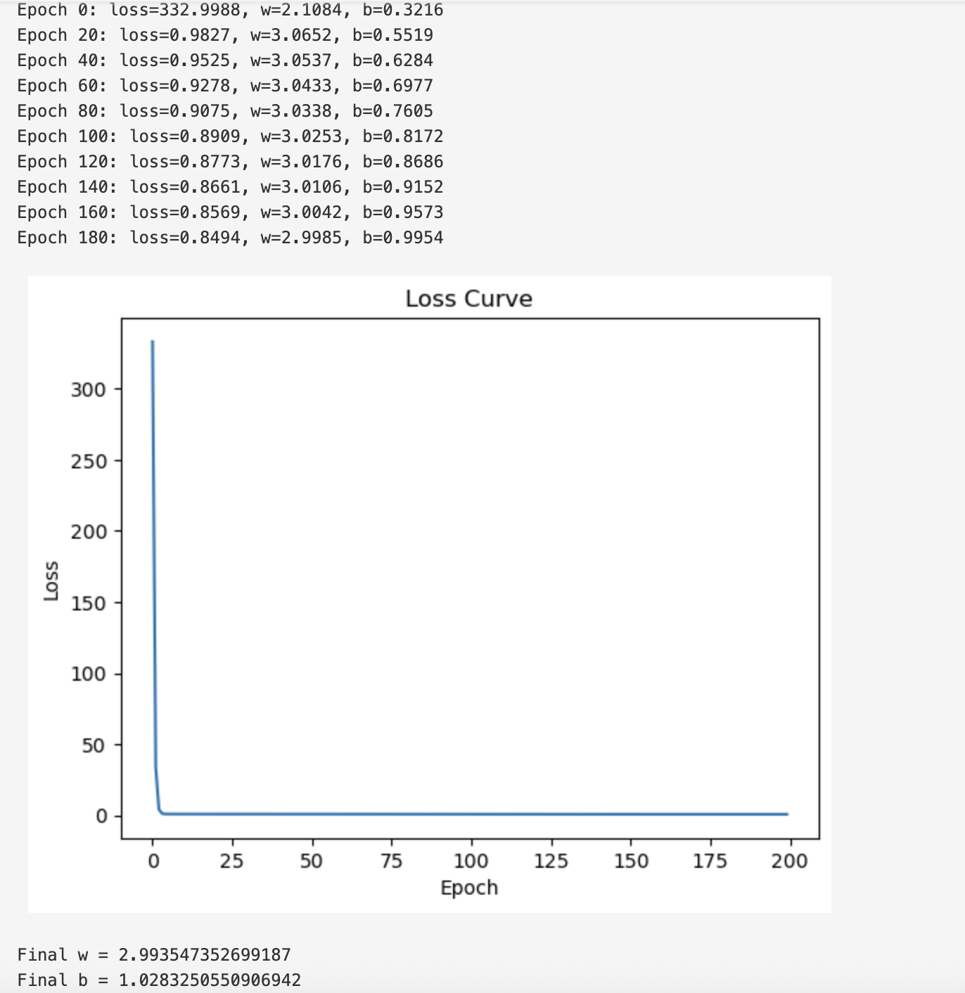 def compute_gradients(x, y_true, y_pred):# TODO:# ∂L/∂w = (2/n) * sum( x * (y_pred - y_true) )# ∂L/∂b = (2/n) * sum( y_pred - y_true )n=x.shape[0]dw=(2/n)*sum(x*(y_pred - y_true))db=(2/n)*sum((y_pred - y_true))return dw, dbpass# ================================