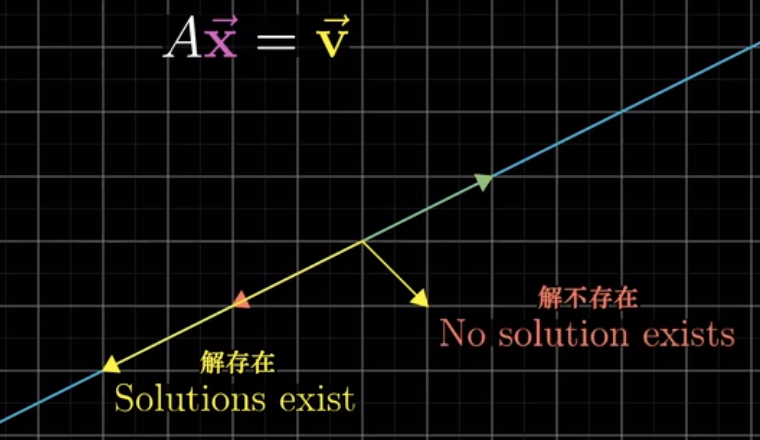行列式不等于0 (对于二维来说,就说明没有压缩成一条直线或者一个点),说明只有一个向量和v重叠,并且可以逆向进行变换找到这个向量。