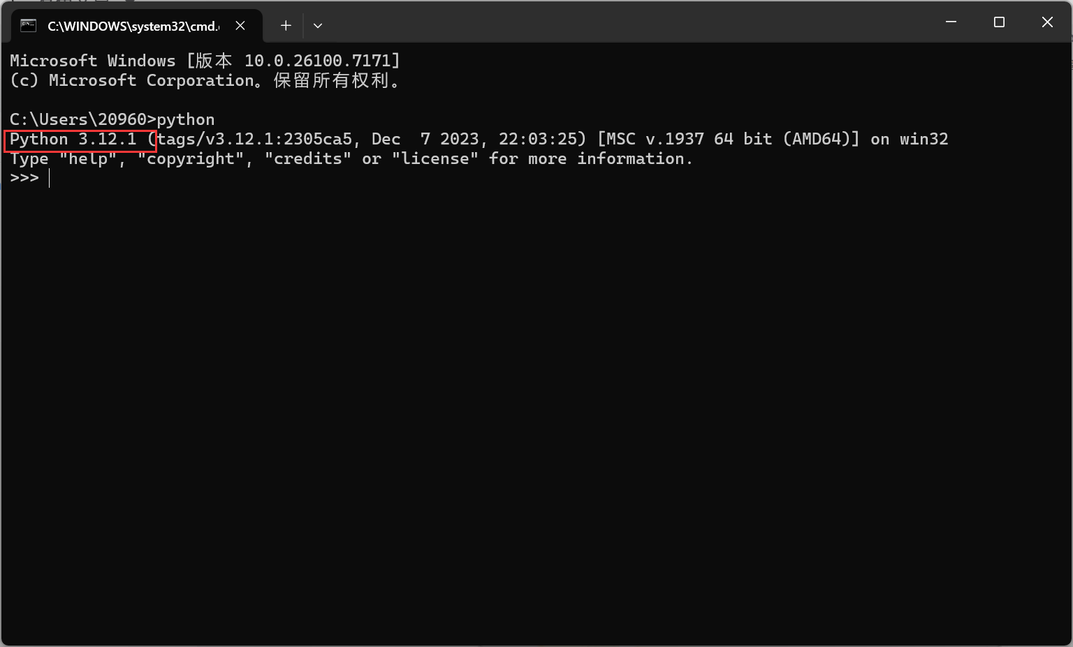 可以打开命令行输入python(win+R键输入cmd命令),来查看是否安装成功。这里可以看到3.12.1版本。