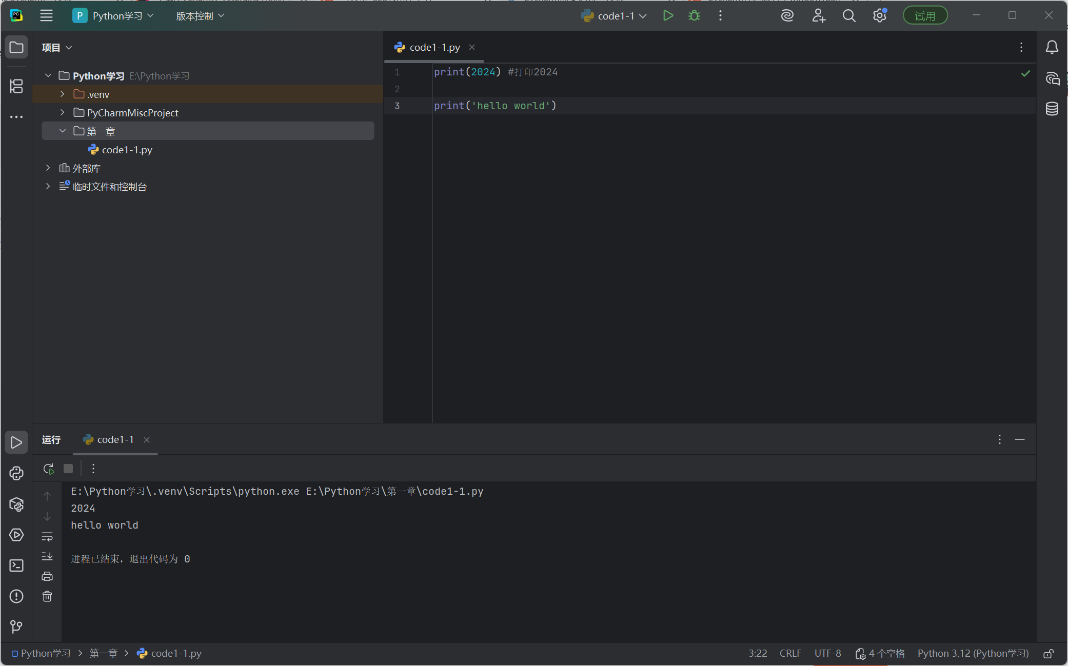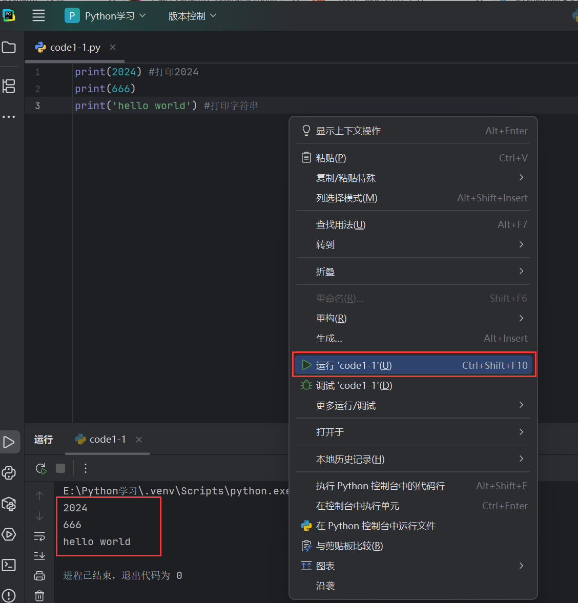 编辑完成后右键运行,即可在下方运行窗口观察到运行结果。第一行程序 hello world即可打印出来。