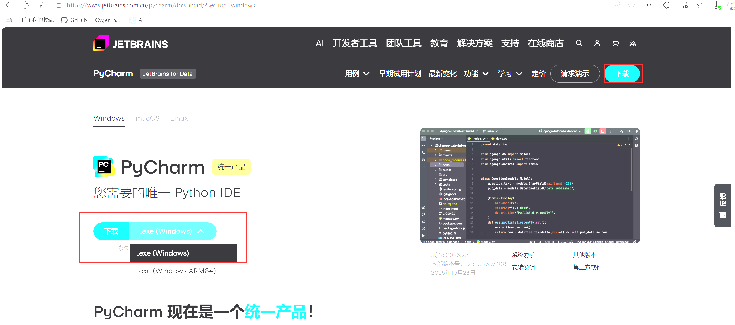 上半部分安装完了解释器,此部分安装编辑器,也就是编辑程序的工具,这里我选择使用Pycharm。目前官网是有两个版本,这里选择Windows的就行。下载 PyCharm:JetBrains 出品的用于数据科学和 Web 开发的 Python IDE