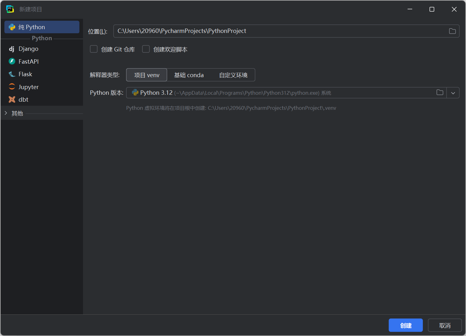 这里的位置选择自己的电脑位置,建议不要放在C盘,点击创建。