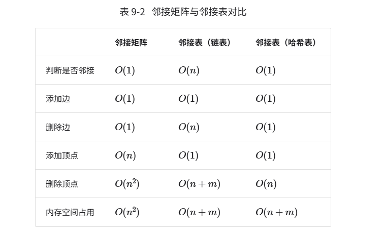 | 判断是否邻接 | (O(1)) | (O(n)) | (O(1)) | 邻接矩阵直接查adjMat[i][j];链表需遍历链表;哈希表直接查集合 |