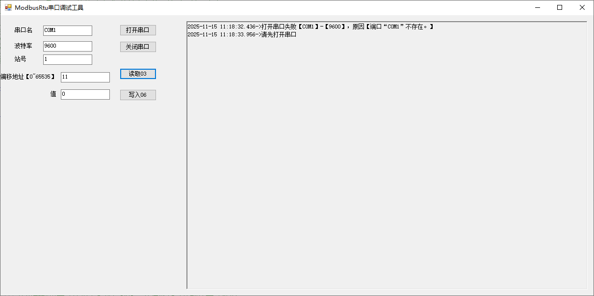 {public partial class FormModbusRtu : Form{SerialPort serialPort = new SerialPort(); private List<byte> buffer = new List<byte>();/// <summary>/// 处理接收的数据事件【考虑到有些通信串口的传输速率较慢,触发多次DataReceived事件,报文会拆包和粘包】/// </summary>private event Action<List<byte>> HandleReceivedDataEvent;public FormModbusRtu(){InitializeComponent();serialPort.DataReceived -= SerialPort_DataReceived;HandleReceivedDataEvent -= FormModbusRtu_HandleReceivedDataEvent;serialPort.DataReceived += SerialPort_DataReceived;HandleReceivedDataEvent += FormModbusRtu_HandleReceivedDataEvent;}/// <summary>/// 处理接收的数据事件【考虑到有些通信串口的传输速率较慢,触发多次DataReceived事件,报文会拆包和粘包】/// 这里整理出有效的报文后进行解析,并清除掉已处理的有效数据/// </summary>/// <param name="recvBuffer"></param>private void FormModbusRtu_HandleReceivedDataEvent(List<byte> recvBuffer){if (recvBuffer == null || recvBuffer.Count < 7) {return;}if (recvBuffer[0] == 0x01 && recvBuffer[1] == 0x03){//假设从机地址【站号】是1 并且是 读取保持寄存器【命令0x03】的反馈int readByteCount = recvBuffer[2];//读取多少个字节//01 03 readByteCount 占用3个字节, 然后 数据占用readByteCount个字节,最后是CRC校验占用2个字节if (3 + readByteCount + 2 <= recvBuffer.Count){byte[] validData = recvBuffer.Take(3 + readByteCount + 2).ToArray();DisplayMessage($"这里对有效的数据进行解析【{string.Join(" ", validData.Select(x => x.ToString("X2")))}】");buffer.RemoveRange(0, 3 + readByteCount + 2);//移除前面的元素【已处理的有效数据删除掉】}}else if (recvBuffer[0] == 0x01 && recvBuffer[1] == 0x06){//假设从机地址【站号】是1 并且是 写入保持寄存器【命令0x06】的反馈if (recvBuffer.Count >= 8){DisplayMessage($"写入保持寄存器【命令0x06】的操作成功,接收到的一条完整报文【{string.Join(" ", recvBuffer.Take(8).Select(x => x.ToString("X2")))}】");buffer.RemoveRange(0, 8);//移除前面的元素【已处理的有效数据删除掉】}}else if (recvBuffer[0] == 0x01 && recvBuffer[1] == 0x10){//假设从机地址【站号】是1 并且是 写入多个连续保持寄存器【命令0x10】的反馈//接收报文01 10 地址高字节 地址低字节 寄存器数量高字节,寄存器数量低字节 CRC校验,CRC校验if (recvBuffer.Count >= 8){DisplayMessage($"写入多个保持寄存器【命令0x10】的操作成功,接收到的一条完整报文【{string.Join(" ", recvBuffer.Take(8).Select(x => x.ToString("X2")))}】");buffer.RemoveRange(0, 8);//移除前面的元素【已处理的有效数据删除掉】}}else {//这里进行其他Modbus命令处理}}private void SerialPort_DataReceived(object sender, SerialDataReceivedEventArgs e){byte[] buf = new byte[serialPort.BytesToRead];serialPort.Read(buf, 0, buf.Length);buffer.AddRange(buf);DisplayMessage($"接收到的报文为【{string.Join(" ", buf.Select(x => x.ToString("X2")))}】");if (buffer.Count >= 7) {HandleReceivedDataEvent?.Invoke(buffer);}}/// <summary>/// 异步显示文本内容/// </summary>/// <param name="message"></param>private void DisplayMessage(string message){if (!IsHandleCreated){return;}this.BeginInvoke(new Action(() =>{if (rtxtMessage.TextLength >= 40960){rtxtMessage.Clear();}rtxtMessage.AppendText($"{DateTime.Now.ToString("yyyy-MM-dd HH:mm:ss.fff")}->{message}\n");rtxtMessage.ScrollToCaret();}));}private void btnOpen_Click(object sender, EventArgs e){serialPort.PortName = txtPortName.Text.Trim();int baudrate;if (!int.TryParse(txtBaudRate.Text, out baudrate)) {baudrate = 9600;}serialPort.BaudRate = baudrate;try{serialPort.Open();DisplayMessage($"打开串口成功【{serialPort.PortName }】-【{serialPort.BaudRate}】");}catch (Exception ex){DisplayMessage($"打开串口失败【{serialPort.PortName }】-【{serialPort.BaudRate}】,原因【{ex.Message}】"); ;}}private void btnClose_Click(object sender, EventArgs e){serialPort.Close();}private void btnRead_Click(object sender, EventArgs e){if (!serialPort.IsOpen) {DisplayMessage($"请先打开串口");return;}buffer.Clear();//先清空报文byte stationNo = byte.Parse(txtStationNo.Text);byte[] bufferAddr = BitConverter.GetBytes(ushort.Parse(txtAddress.Text));//读取两个寄存器的值,将反馈4个字节byte[] srcBytes = new byte[] { stationNo, 0x03, bufferAddr[1], bufferAddr[0], 0x00, 0x02 };byte[] bufferCRC = CRC16Modbus.CRCCalc(srcBytes);byte[] sendBytes = new byte[srcBytes.Length + 2];Array.Copy(srcBytes, 0, sendBytes, 0, srcBytes.Length);sendBytes[sendBytes.Length - 2] = bufferCRC[0];sendBytes[sendBytes.Length - 1] = bufferCRC[1];serialPort.DiscardOutBuffer();serialPort.Write(sendBytes,0, sendBytes.Length);DisplayMessage($"【读取】发送命令【{string.Join(" ", sendBytes.Select(x => x.ToString("X2")))}】");if (SpinWait.SpinUntil(() => this.buffer.Count > 0, 5000)){byte[] recvBytes = buffer.ToArray();DisplayMessage($"【读取】读取到的反馈报文为【{string.Join(" ", recvBytes.Select(x => x.ToString("X2")))}】");if (recvBytes.Length >= 5) {ushort angle = BitConverter.ToUInt16(new byte[] { recvBytes[4], recvBytes[3] }, 0);txtValue.Text = angle.ToString();}}else{DisplayMessage($"接收数据超时【5S】");}}private void btnWrite_Click(object sender, EventArgs e){if (!serialPort.IsOpen){DisplayMessage($"请先打开串口");return;}buffer.Clear();//先清空报文byte stationNo = byte.Parse(txtStationNo.Text);byte[] bufferAddr = BitConverter.GetBytes(ushort.Parse(txtAddress.Text));byte[] writeBuffer = BitConverter.GetBytes(ushort.Parse(txtValue.Text));byte[] srcBytes = new byte[] { 0x03, stationNo, 0x06, bufferAddr[1], bufferAddr[0], writeBuffer[1], writeBuffer[0] };byte[] bufferCRC = CRC16Modbus.CRCCalc(srcBytes);byte[] sendBytes = new byte[srcBytes.Length + 2];Array.Copy(srcBytes, 0, sendBytes, 0, srcBytes.Length);sendBytes[sendBytes.Length - 2] = buffe