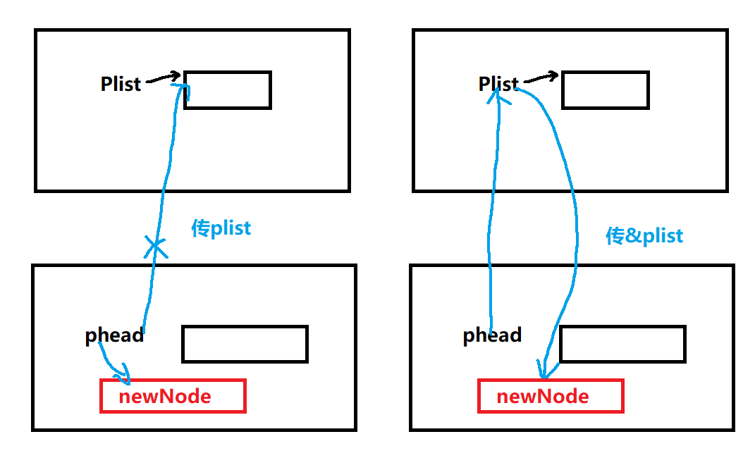 而传递二级指针,SLTPushBack(&plist, 1);phead会指向plist,形参是SLTNode** pphead,申请空间后,将*phead指向新地址,会让plist指向新地址。