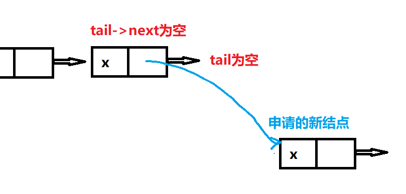 {// 构造新结点SLTNode* newNode = (SLTNode*)malloc(sizeof(SLTNode));if (newNode == NULL){perror("malloc fail!\n");return;}newNode->data = x;newNode->next = NULL;if (*pphead == NULL){*pphead = newNode;}else{// 链接尾部结点SLTNode* tail = *pphead;while (tail->next != NULL)//注意尾部结点是尾部的结点下一个为空,不能是此结点为空{tail = tail->next;}tail->next = newNode; // 链接}