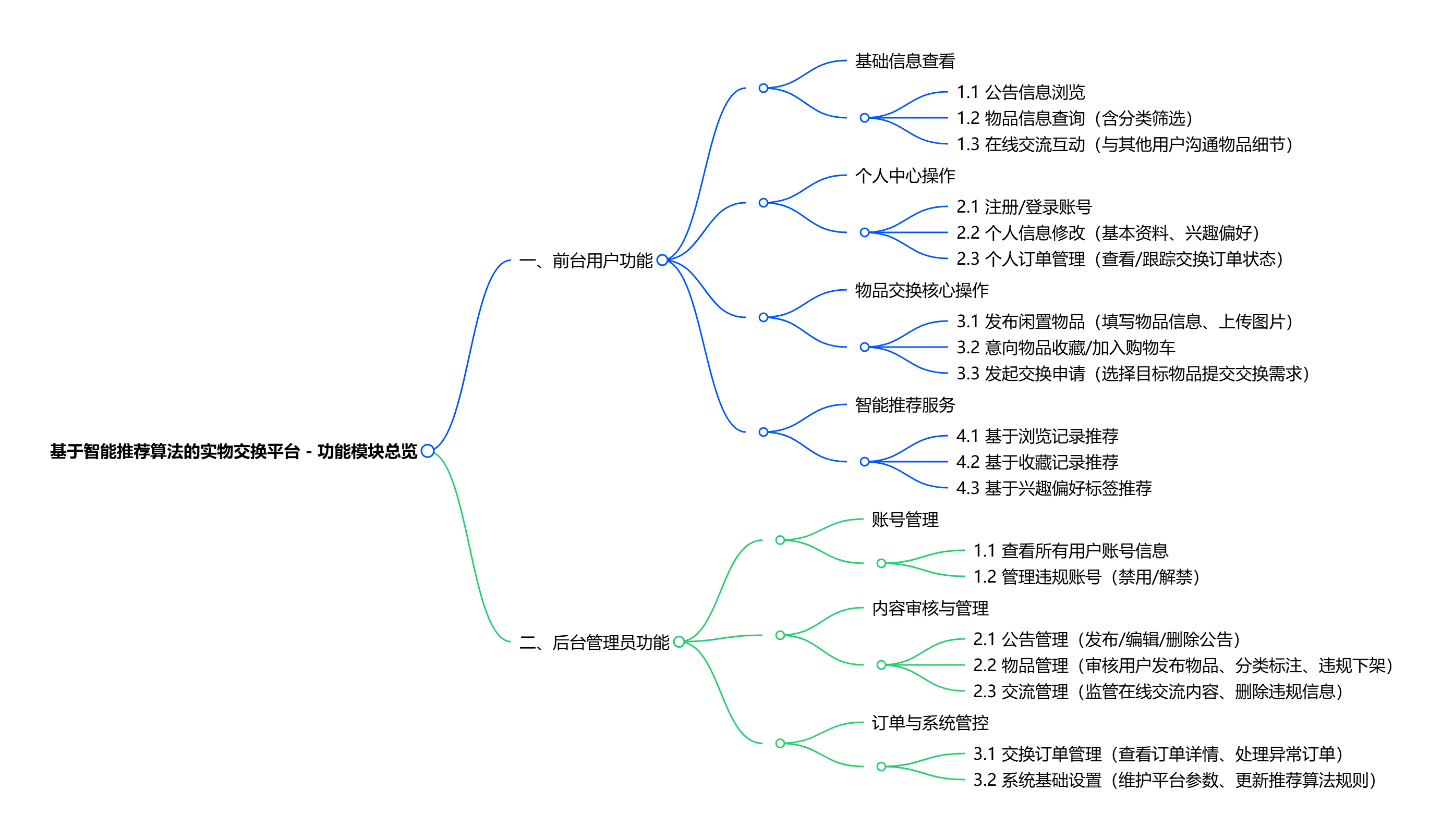 - 后台管理员功能:负责平台整体管控,包括管理用户账号、审核发布公告、分类及审核物品信息、监管在线交流内容、处理交换订单,以及维护系统基础设置,保障平台规范运行。
