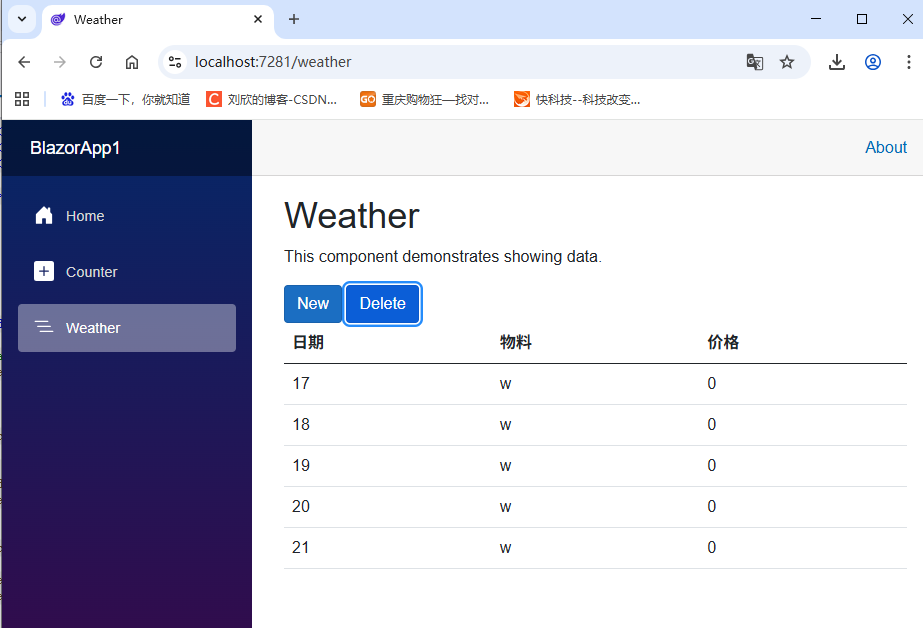 新建一个自己的数据库,里面新建一个自己的表:我们就在这个表上读写。在VS2022微软自带的Blazor server模式示例代码中,增加EFcore并开始使用: