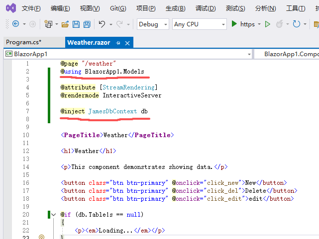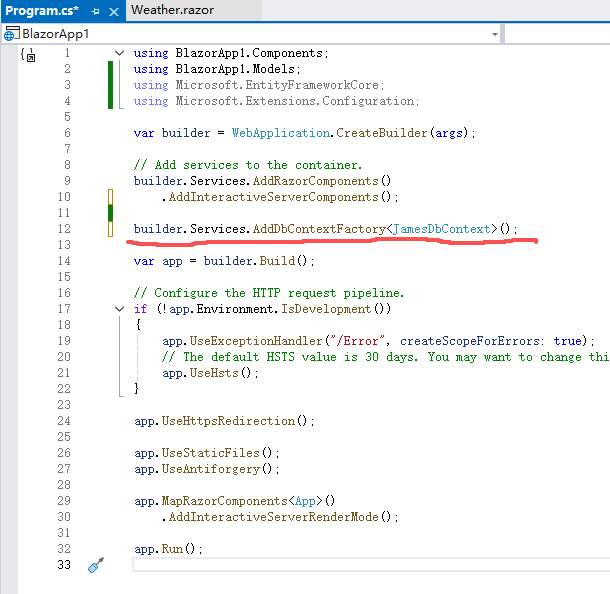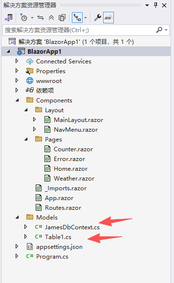 EF core自动新建了实体类文件,同WinForm项目没有区别。接下来,我们在Program.cs文件中加入数据库工厂。只一行代码。builder.Services.AddDbContextFactory<JamesDbContext>();