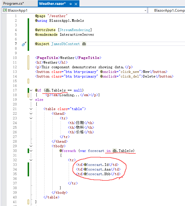 {protected override async Task OnInitializedAsync(){// Simulate asynchronous loading to demonstrate streaming renderingawait Task.Delay(500); }private void click_new(){Table1 one = new Table1(){ Aaa = "w",Bbb = "0" };db.Table1s.Add(one);db.SaveChanges();}private void click_del(){ db.Table1s.Remove(db.Table1s.First());db.SaveChanges();}private void click_edit(){ }}