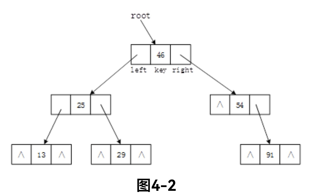 图4-1(g)所示二叉查找树的二叉链表表示如图4-2所示。