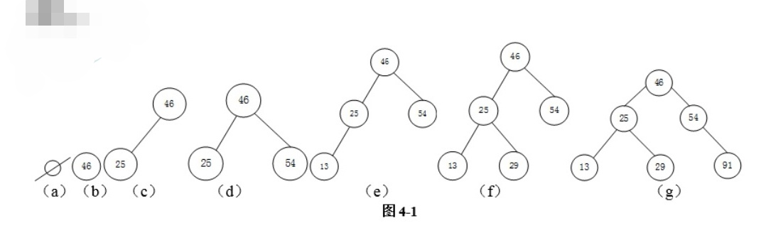 根据关键码序列{46,25,54,13,29,91}造一个二叉查找树的过程如图4-1所示。
