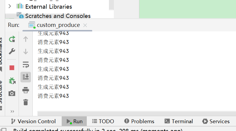 public class custom_produce{public static void main(String[] args) throws InterruptedException {BlockingQueue<Integer> blockingQueue = new LinkedBlockingQueue<Integer>();Thread customer=new Thread(()->{while (true){try {int value= blockingQueue.take();System.out.println("消费元素"+value);} catch (InterruptedException e) {throw new RuntimeException(e);}}},"消费者");customer.start();Thread producter=new Thread(()->{Random random=new Random();int num= random.nextInt(1000);while (true){try {System.out.println("生成元素"+num);blockingQueue.put(num);Thread.sleep(1000);} catch (InterruptedException e) {throw new RuntimeException(e);}}},"生产者");producter.start();customer.join();producter.join();}
