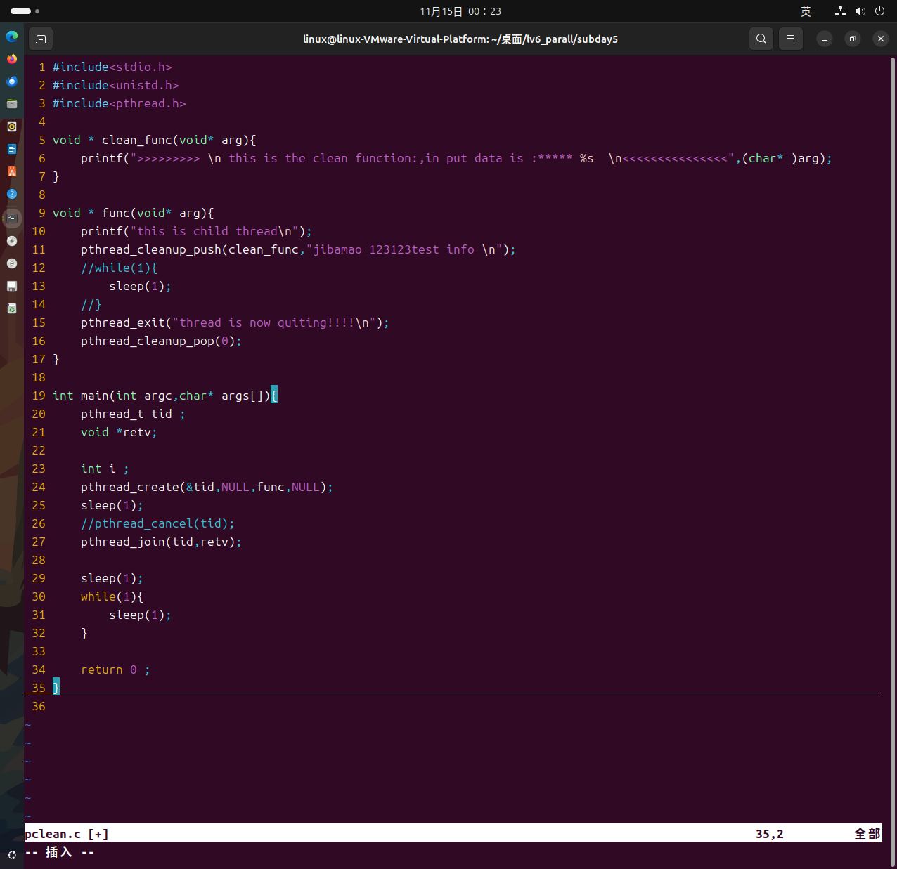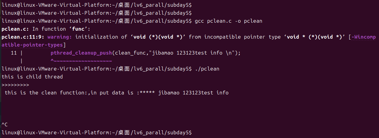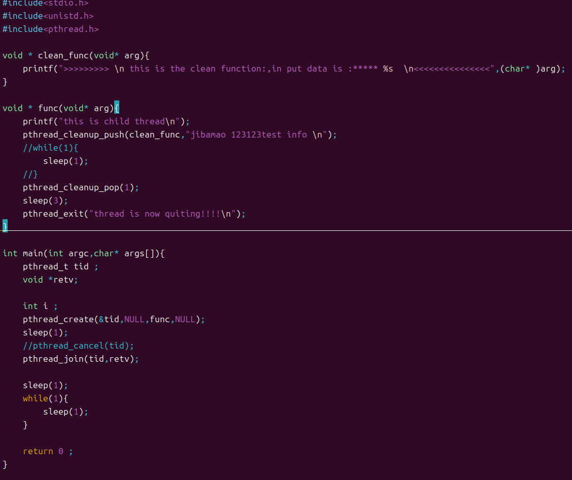 cvoid *func(void* arg){printf("this is child thread\n");pthread_cleanup_push(clean_func,"jibanao 123123test info \n");while(1){sleep(1);}pthread_exit("thread is now quitting!!!!\n");pthread_cleanup_pop(0);