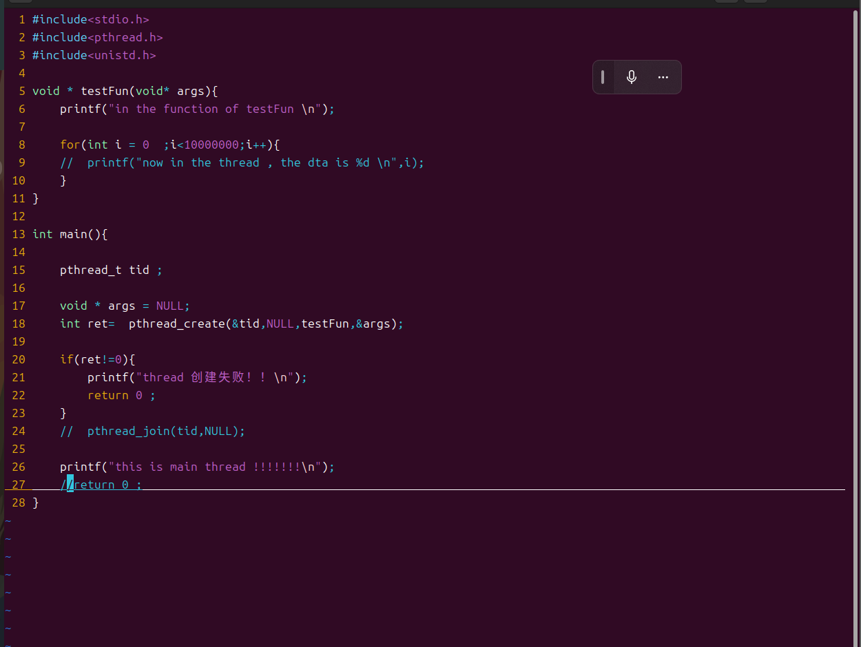 int main(int argc,char* args[]){pthread_t tid ;void *retv;int i ;pthread_create(&tid,NULL,func,NULL);sleep(1);pthread_cancel(tid);pthread_join(tid,&retv);sleep(1);while(1){sleep(1);}return 0;