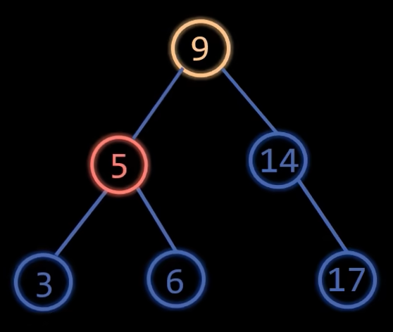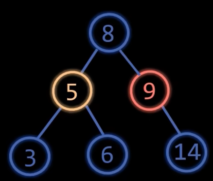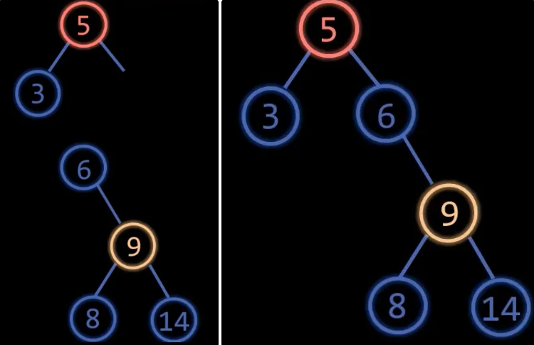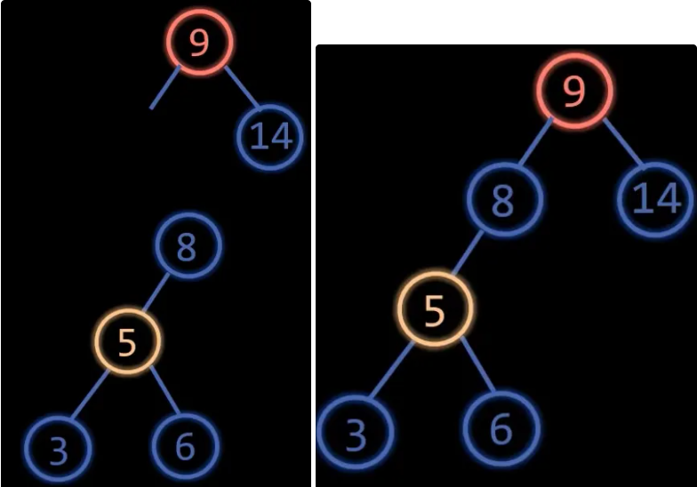 这种情况的话我们先左旋节点9的左孩子节点8,可以看到左旋节点8的过程也符合上文提到的左旋中:“冲突的左孩变右孩”相当于节点8左旋取代原本节点5的位置,然后节点5也左旋变成节点8的左孩子,原本节点8的左孩子就是口诀中提到的这个“冲突的左孩”。