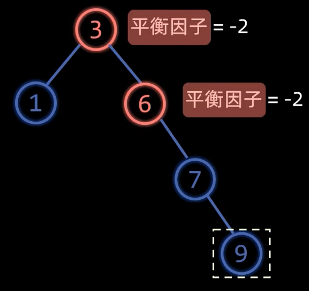 由于节点9的插入,导致树出现了两个失衡节点,这个时候只需要调整距离插入节点9最近的失衡节点就可以了