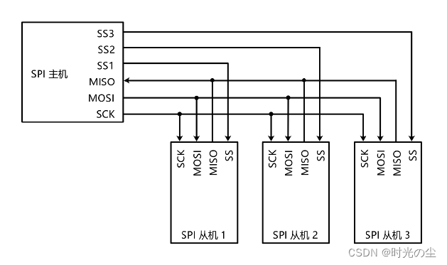 - 主机另外引出多条SS控制线,分别接到各从机的SS引脚;