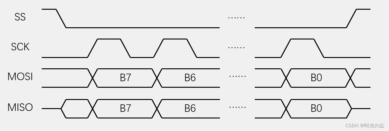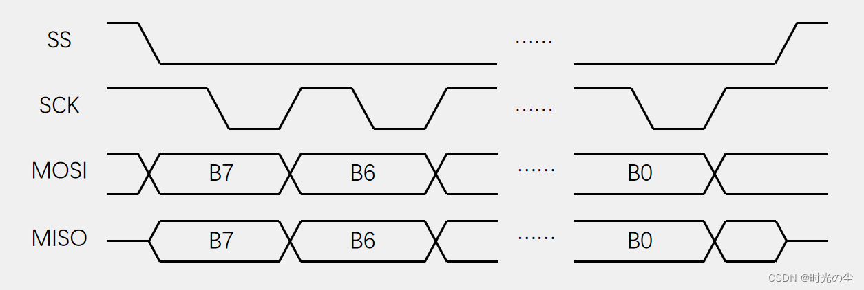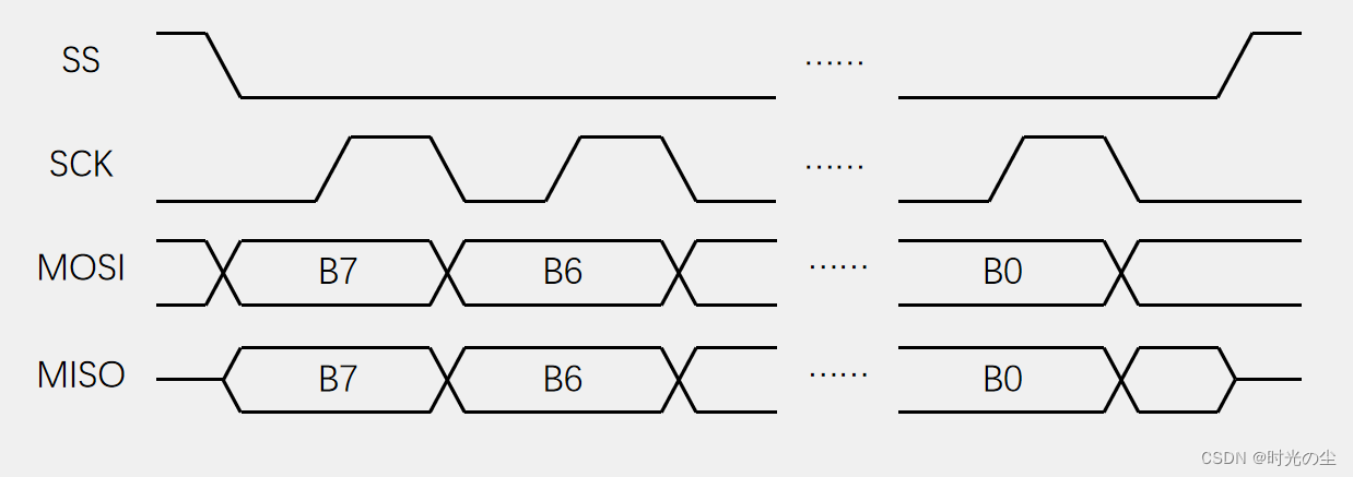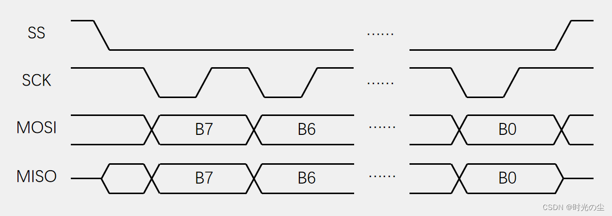 - SS(Slave Select)从机选择(若是有多个从机,有几个从机就有几条SS线,可见硬件电路中的连接图)。