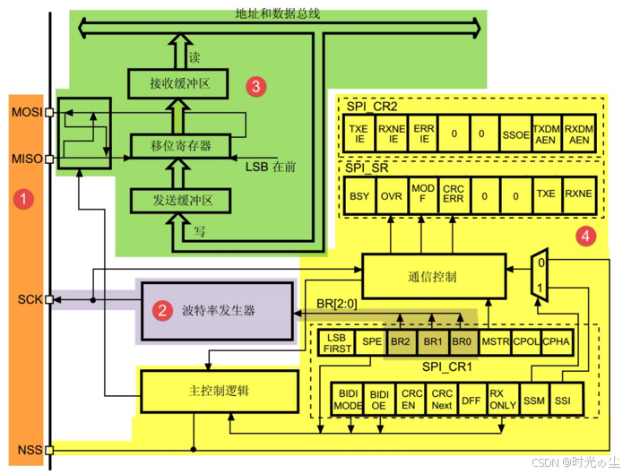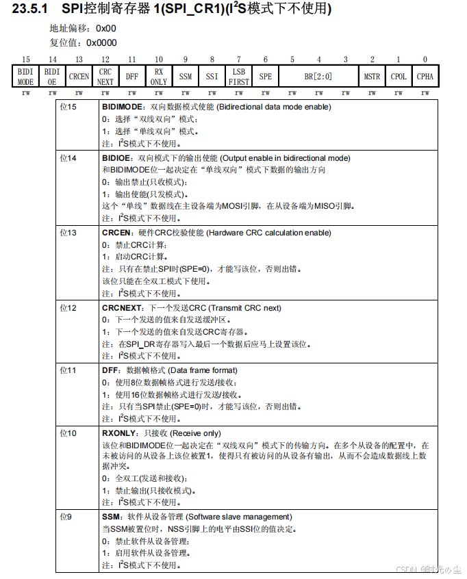 整体控制逻辑负责协调整个SPI外设,控制逻辑的工作模式根据“控制寄存器(CR1/CR2)”的参数而改变,基本的控制参数包括前面提到的SPI模式、波特率、LSB先行、主从模式、单双向模式等等,具体可以通过数据手册进行查看: