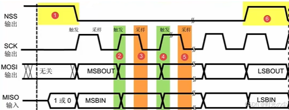 基本时序图,这里之列举出了一种,对于①和⑥好理解就是开始和结束,但是对于②③④⑤的触发和采样起始SPI没有硬性的要求必须是上升沿触发还是下降沿触发,或者是上升沿采样还是下降沿采样,这个需要我们自己进行规定,其中需要引出两个概念: