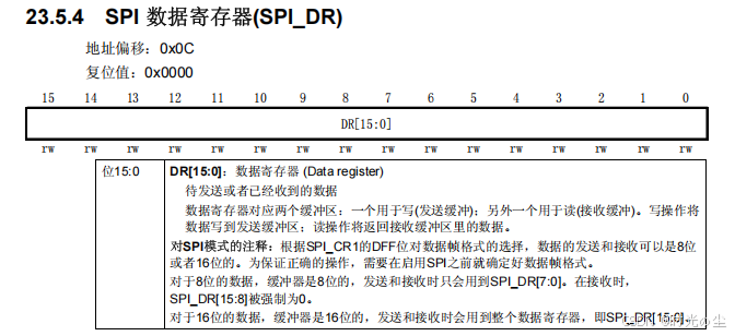 - 通过写SPI的“数据寄存器DR”把数据填充到发送缓冲区中。