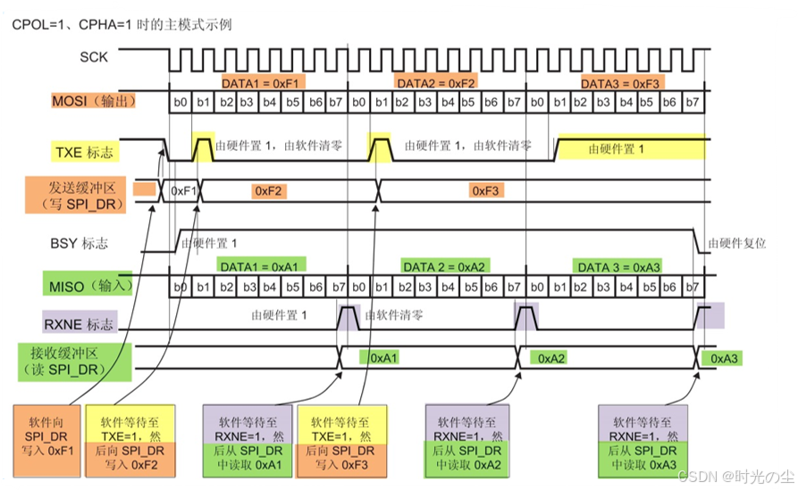 CPHA=1:SCK第一个边沿移出数据,第二个边沿移入数据
