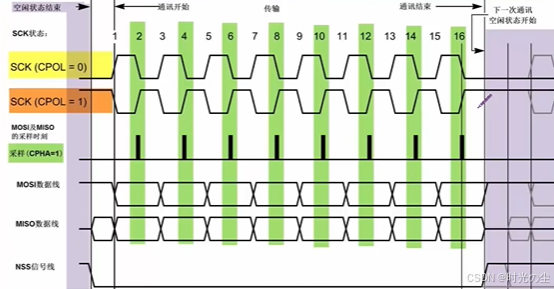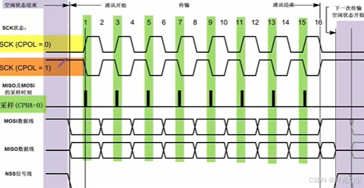 时钟极性(CPOL):是指SPI设备处于空闲状态时,SCK信号线的电平信号(即SPI通讯开始前,NSS线为高电平的SCK的状态)。CPOL=0时,SCK在空闲状态为低电平;COPL=1时,SCK在空闲状态为高电平。
