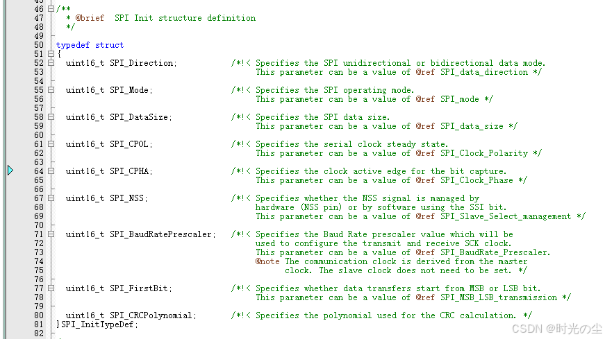 {uint16_t SPI_Direction; /*!< 指定SPI单向或双向数据模式。该参数可以是 @ref SPI_data_direction 的值 */uint16_t SPI_Mode; /*!< 指定SPI工作模式。该参数可以是 @ref SPI_mode 的值 */uint16_t SPI_DataSize; /*!< 指定SPI数据大小。该参数可以是 @ref SPI_data_size 的值 */uint16_t SPI_CPOL; /*!< 指定串行时钟稳态。该参数可以是 @ref SPI_Clock_Polarity 的值 */uint16_t SPI_CPHA; /*!< 指定位捕获的时钟有效边沿。该参数可以是 @ref SPI_Clock_Phase 的值 */uint16_t SPI_NSS; /*!< 指定NSS信号是由硬件(NSS引脚)管理还是通过使用SSI位的软件管理。该参数可以是 @ref SPI_Slave_Select_management 的值 */uint16_t SPI_BaudRatePrescaler; /*!< 指定用于配置发送和接收SCK时钟的波特率预分频值。该参数可以是 @ref SPI_BaudRate_Prescaler 的值。@注意 通信时钟源自主时钟。从设备时钟不需要设置。*/uint16_t SPI_FirstBit; /*!< 指定数据传输从最高有效位(MSB)还是最低有效位(LSB)开始。该参数可以是 @ref SPI_MSB_LSB_transmission 的值 */uint16_t SPI_CRCPolynomial; /*!< 指定用于CRC计算的多项式。*/