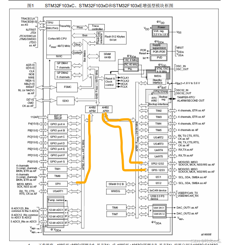 其中SPI1是APB2上的设备,最高通信速率达36Mbtis/s,SPI2、SPI3是APB1上的设备,最高通信速率为18Mbits/s。除了通讯速率,在其它功能上没有差异: