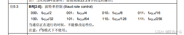 SCK线的时钟信号,由波特率发生器根据“控制寄存器CR1”中的BR[0:2]位控制,该位是对fpclk时钟的分频因子,对fpclk的分频结果就是SCK引脚的输出时钟频率(图在数据手册23.5.1):