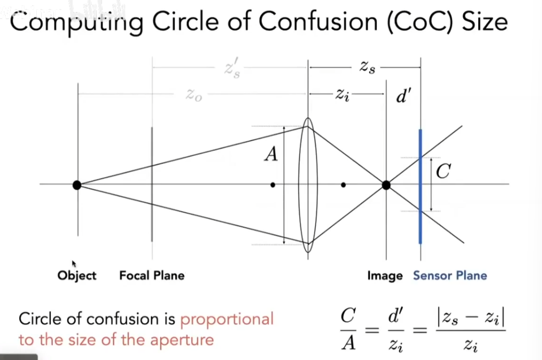 Coc弥散圈指的是,假如你有一个平面Focal Plane,这个平面上的点通过透镜都会到成像平面上(最锐利的那个平面)。如果物体不在Focal Plane上,一个点穿过透镜变成了一个圆,就会出现模糊。并且这个模糊程度和透镜本身的大小成正比。
