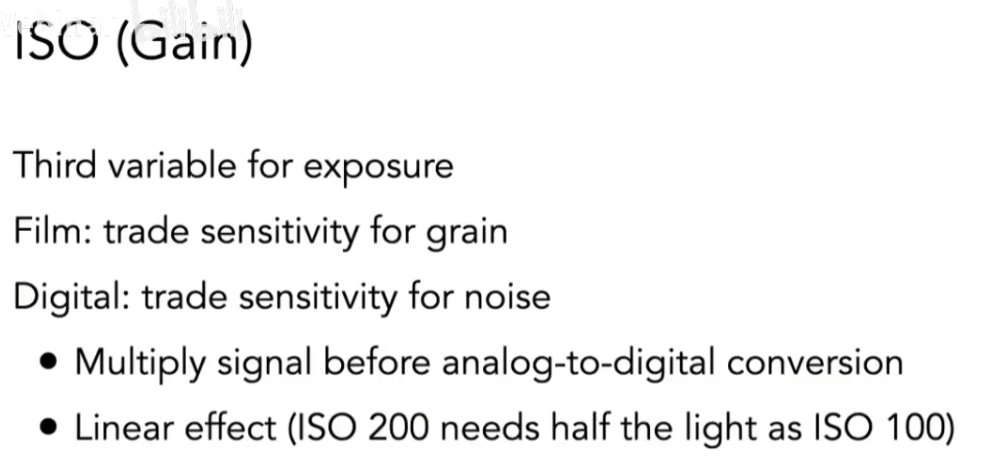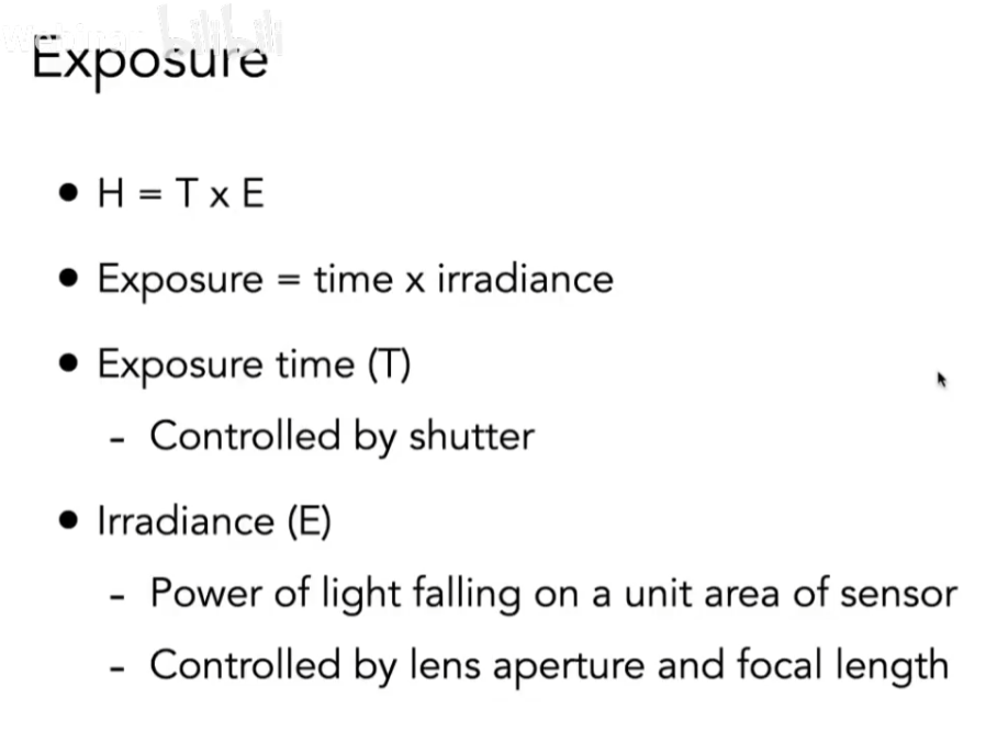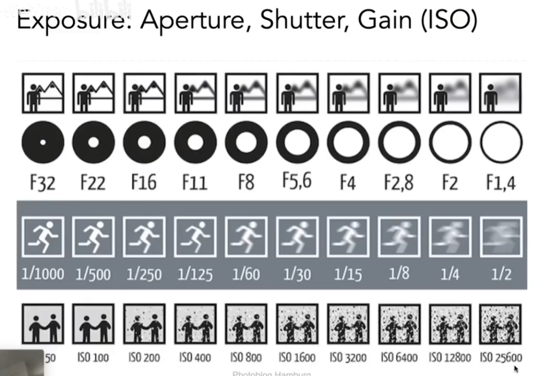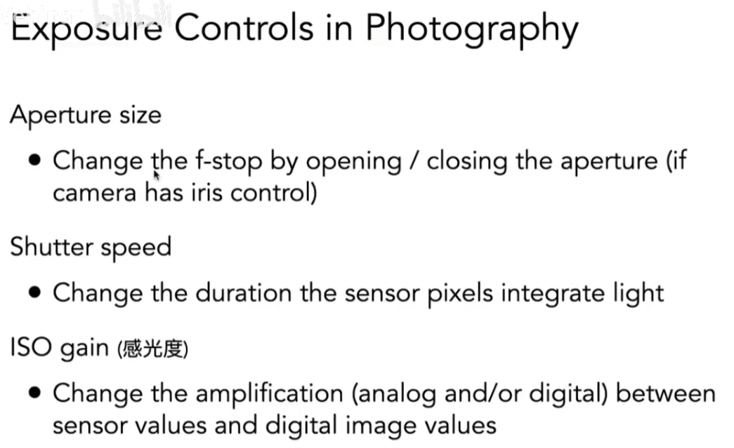 影响曝光的因素:光圈大小、快门速度、感光度(ISO增益,简单理解为后处理,将最后接收到的能量乘以某个数)