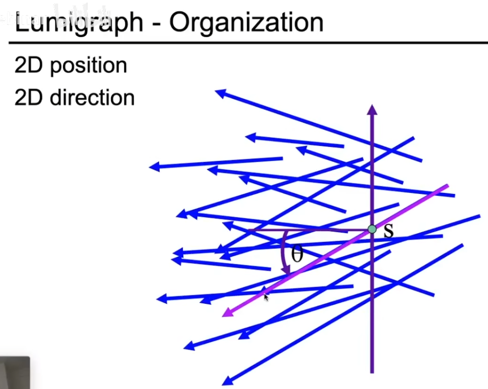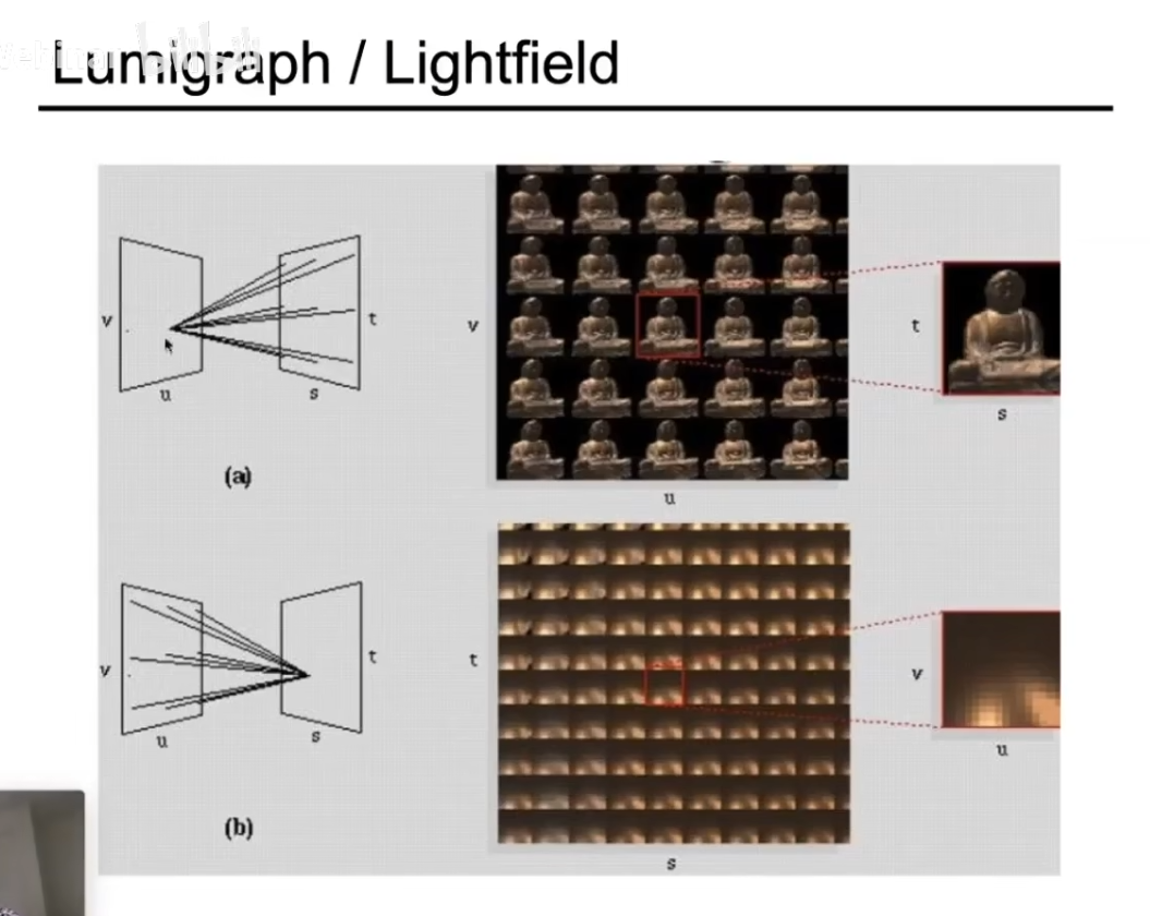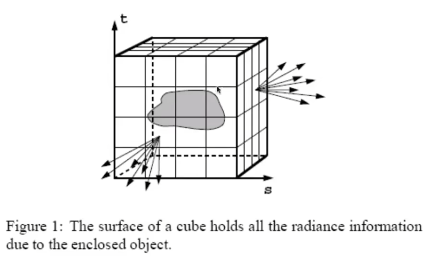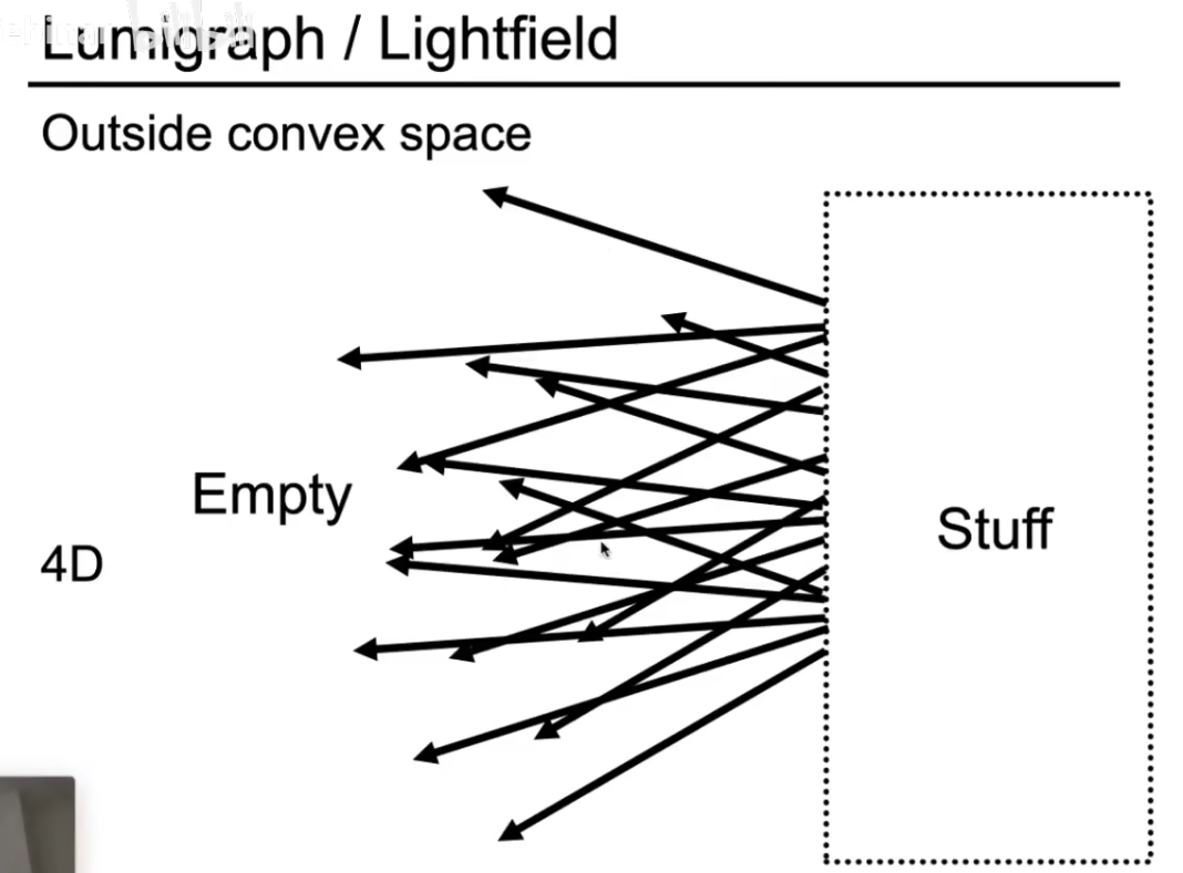 如果我们希望定义一个物体的表面,可以将这个物体放在盒子里。可以将这个问题转化为描述这个物体能被看到的所有情况:这个物体在它的包围盒上,它在任何一个位置,往任何一个方向过去的光线。把这些信息记录起来,就是光场。光场就是在任何一个位置,往任何一个方向去的光的强度。光场只是全光函数的一小部分:二维的位置,二维的方向。