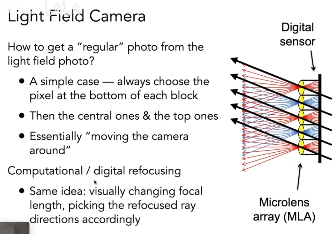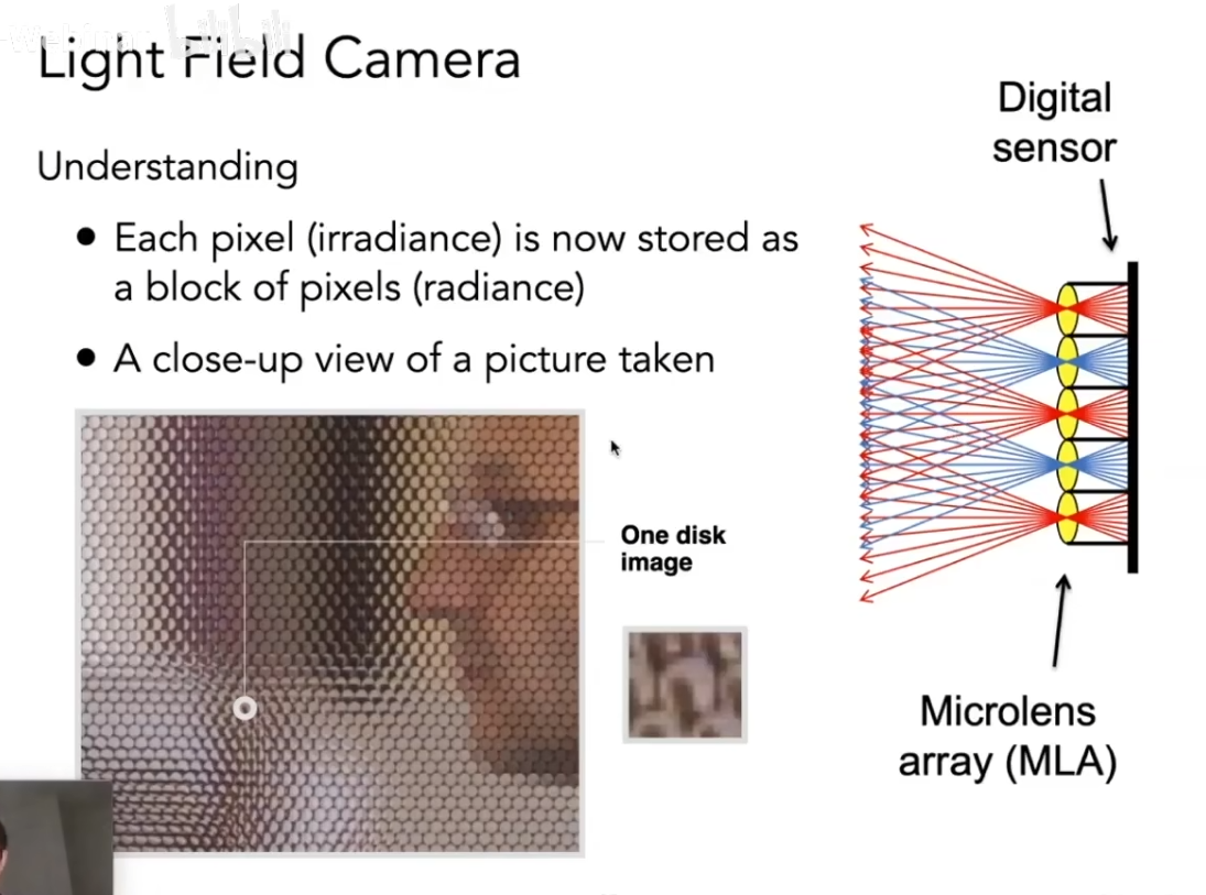当然光场照相机也有问题,它通常都有分辨率不足的问题,原来的相机是用一个像素记录一个像素的信息,但是现在需要100个像素才能记录一个像素的信息,因为不同的方向被分开了。在方向上记录的信息更多,就会挤压位置上的记录。并且造假昂贵。