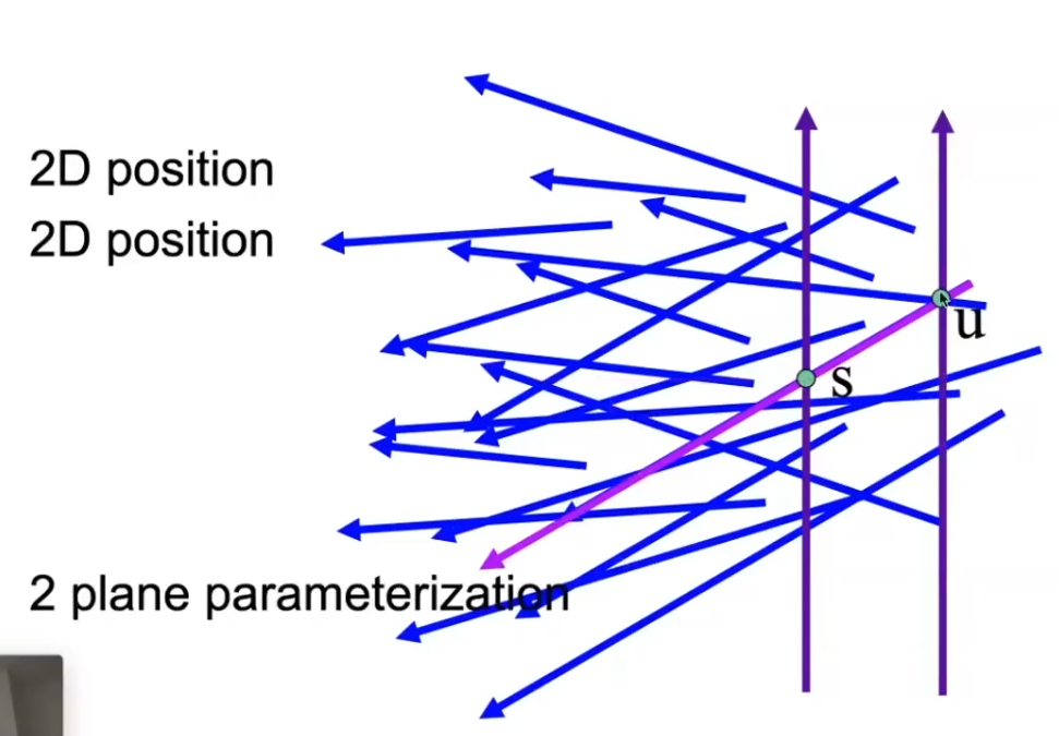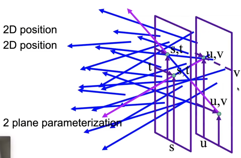 我们放置两个平行的平面(比如UV平面和ST平面)。一条光线会先后穿过这两个平面。那么,对于光场,我们只需要找到所有的uv、st的组合就可以了。现在,描述一条光线只需要 两个2D位置:(u, v) 和 (s, t)。