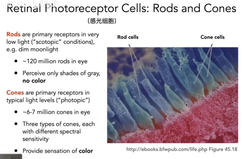 眼睛作为摄像机,视网膜上的感光细胞(锥形细胞)负责感知颜色。