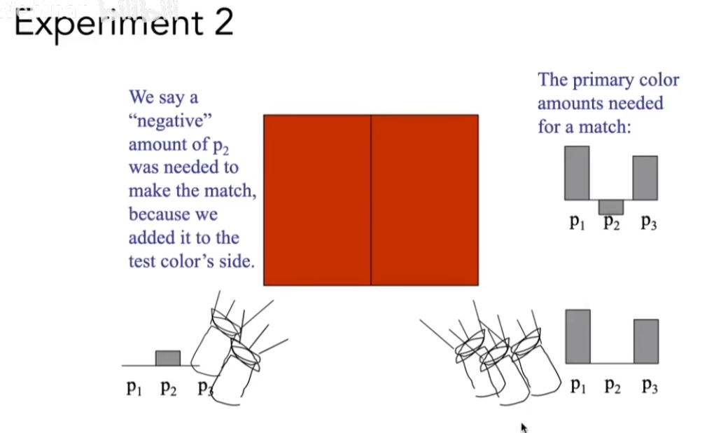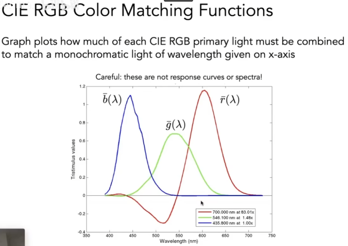 对于现实世界中不同波长的光,通过实验进行测量,得到不同波长颜色的匹配函数,也可以发现红色曲线有负值。