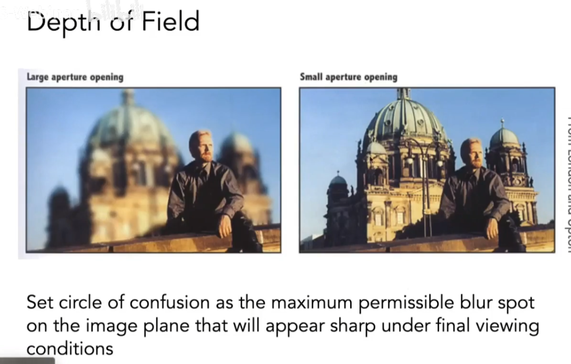 景深指的是,在场景中存在一段深度,这段深度经过透镜之后的Coc是足够小的。