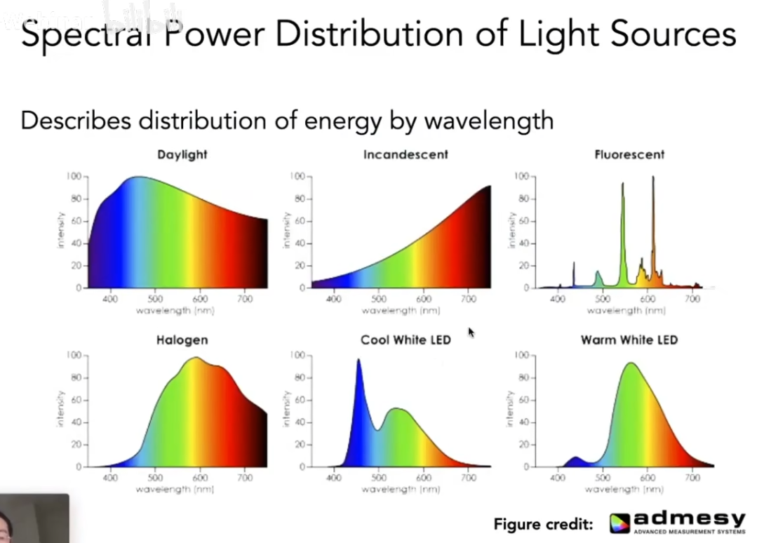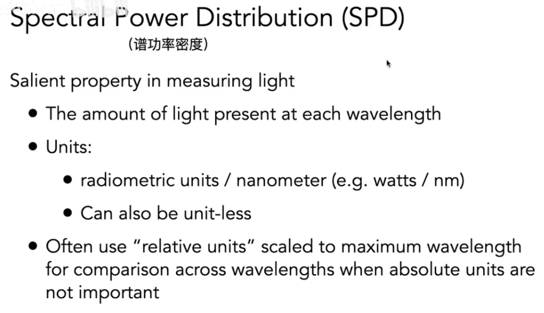 可见光光谱分布在400nm到700nm之间,研究光谱时引入谱功率密度SPD,可以描述光在不同波长下的分布。