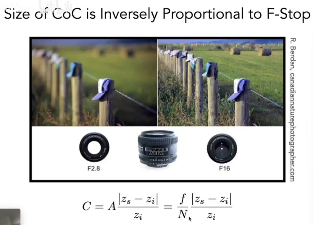 之前提到,光圈的F数是焦距/光圈直径。结合以上公式可以得到,Coc与f数成正比,那么假如我们想拍不模糊的图像,就要用小光圈。