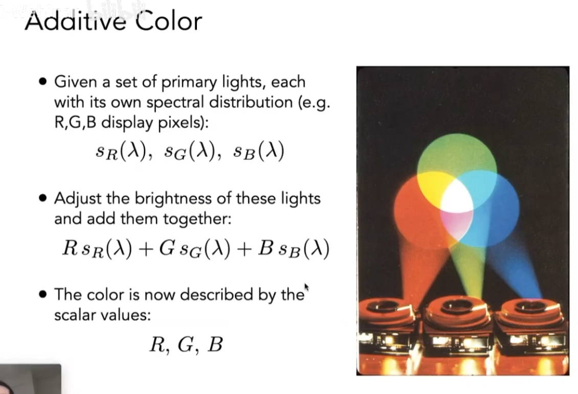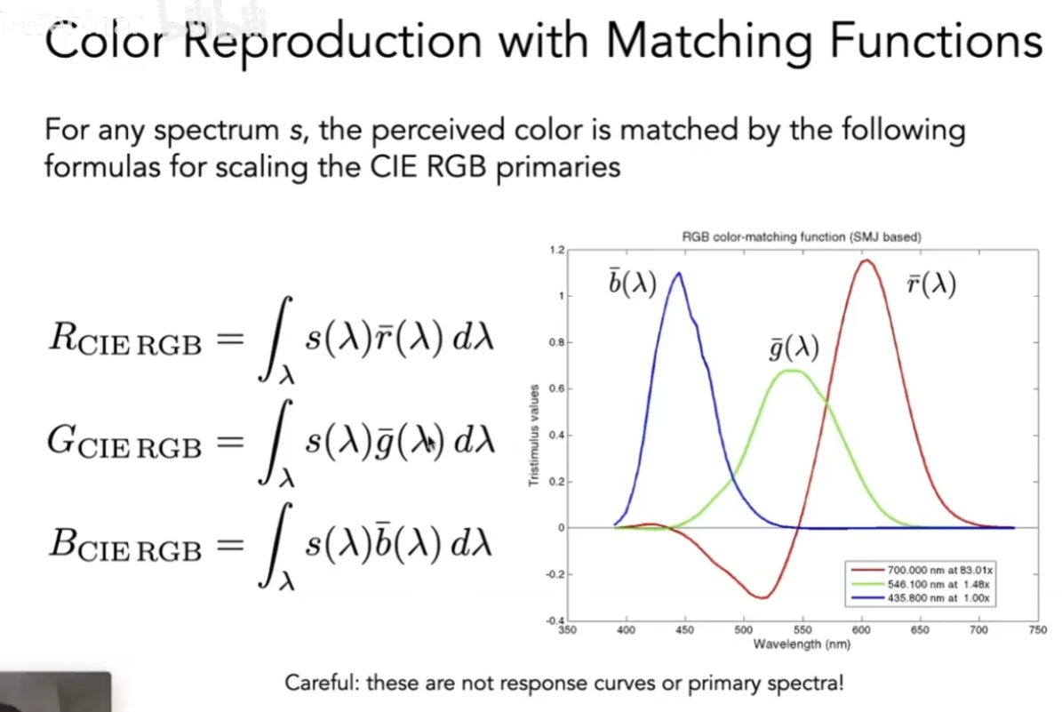那么现在给你任意一个spd函数(光在不同波长下的分布),我们就可以得到这个spd函数表示的颜色(光)。这就是RGB系统。