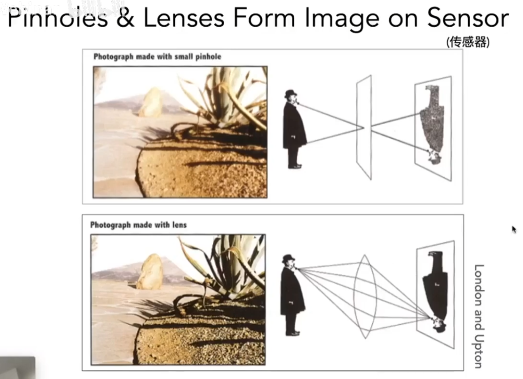 最简单的成像方式就是捕捉Capture,摄像机拍照就是一种捕捉方式。常见的相机有小孔成像的相机和透镜的相机。